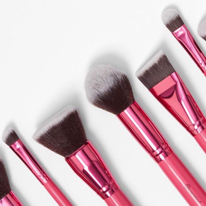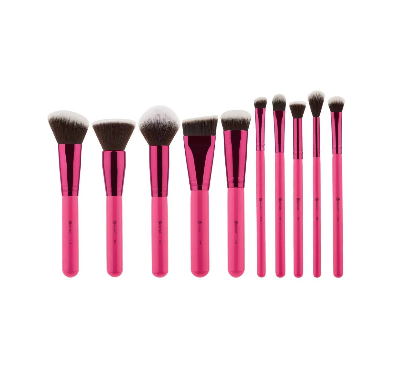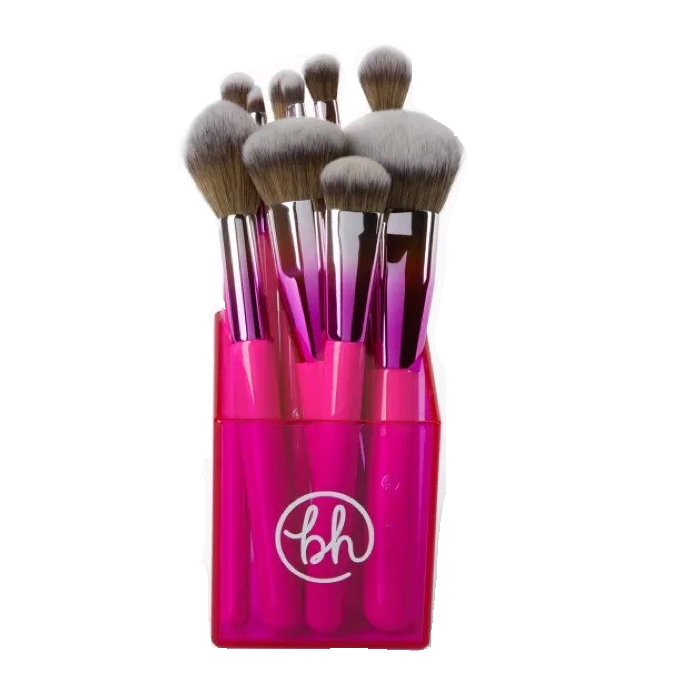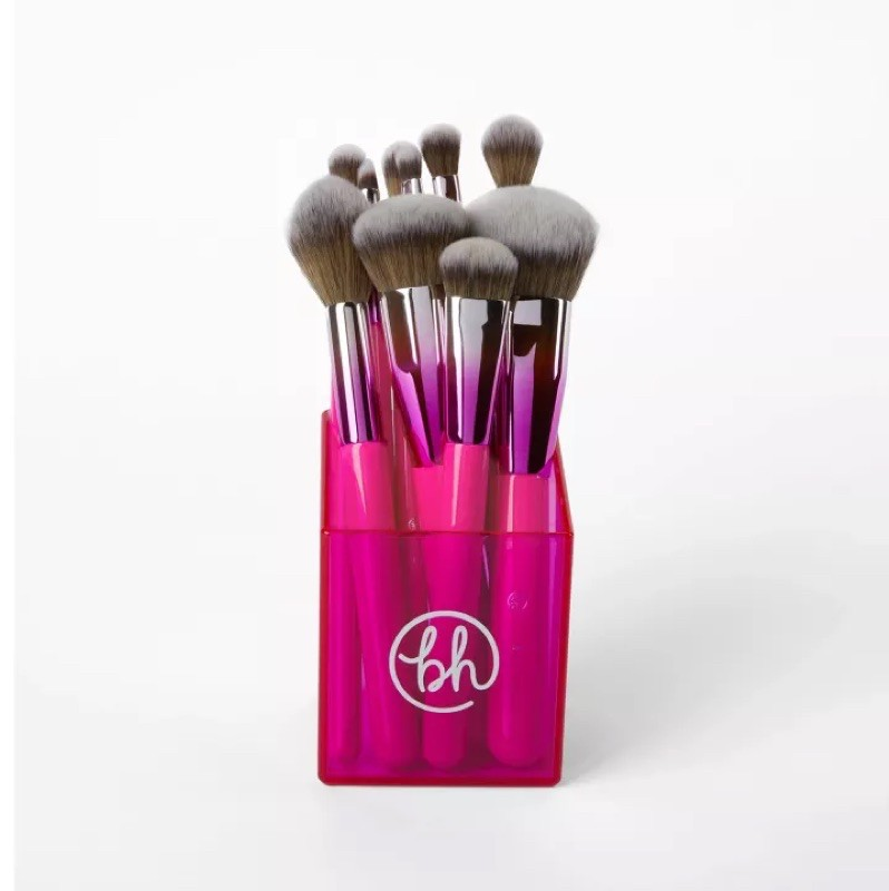 -Bộ cọ BH Cosmetic gồm 10 cây cho mặt và mắt cực xịn xò kèm ống đựng chổi với màu sắc chủ đạo là hồng metallic.