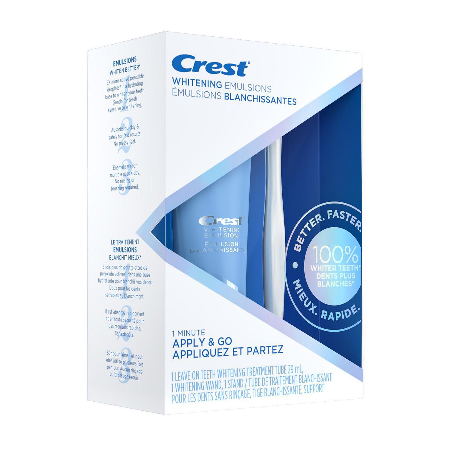 • GEL tẩy trắng răng Crest Whitening Emulsions Leave-on Teeth Whitening with Wand Applicator hoàn toàn mới là một công thức đột phá bao gồm một lớp mỏng 5x giọt peroxide hoạt tính lơ lửng trong lớp nền dưỡng ẩm giúp bạn hầu như không bị ê buốt.